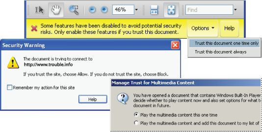 Возможно, вы просматриваете эту страницу, поскольку нажали кнопку «Справка» в предупреждении об опасности. Предупреждения об опасности появляются в PDF-файлах в самых различных формах. Три из них приведены ниже.