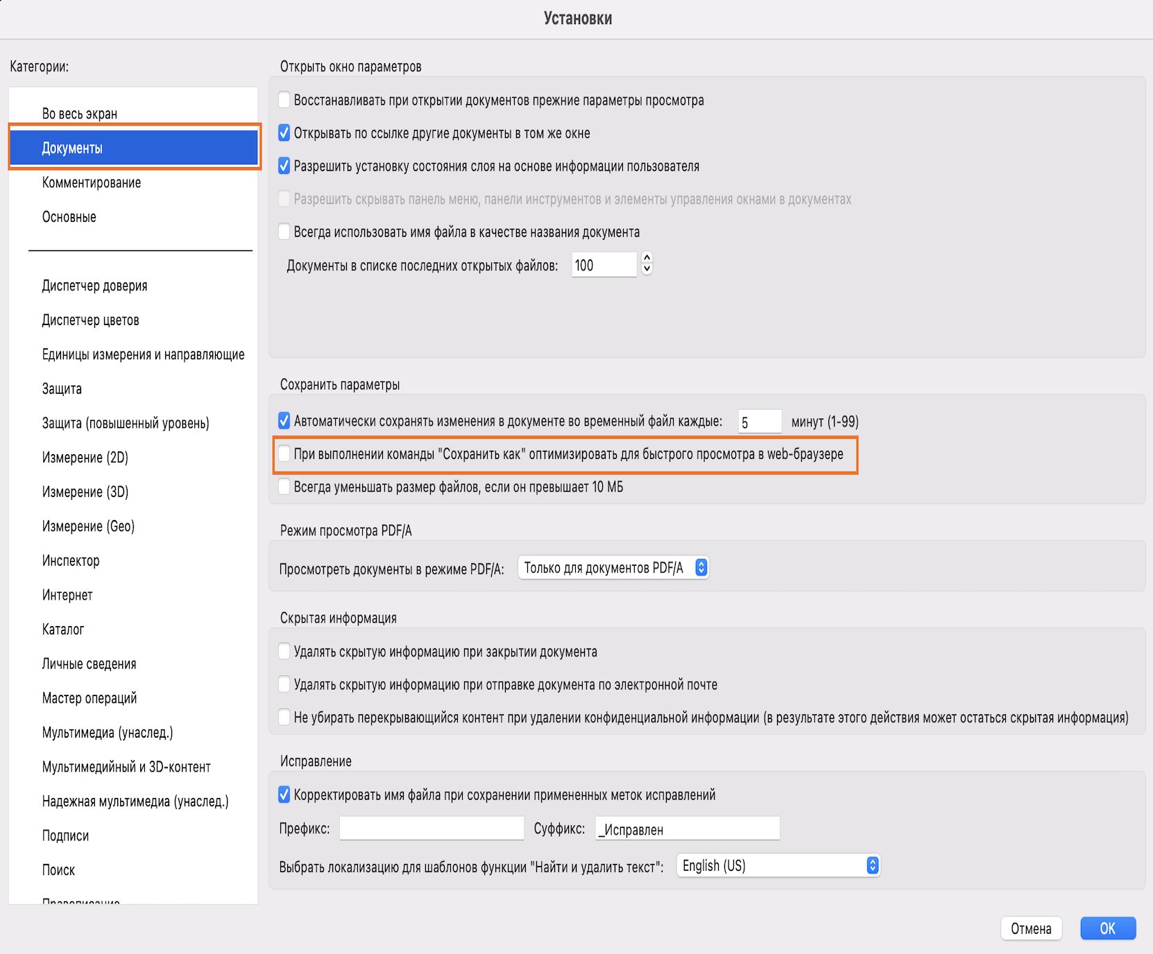 В списке Категории выберите «Документы» и отмените выбор параметра При выполнении команды «Сохранить как» оптимизировать для быстрого просмотра в веб-браузере.