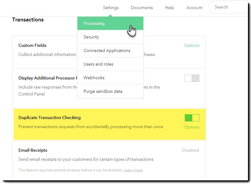 2. Перейдите в Настройки > Обработка > Проверка повторяющихся транзакций.