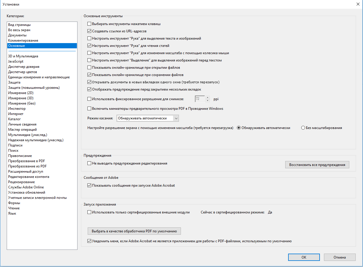 Диалоговое окно «Установки» определяет вид страницы по умолчанию и позволяет менять другие параметры. Для настройки просмотра файлов PDF предназначены параметры в областях Документы, Во весь экран, Основные, Вид страницы и 3D и мультимедиа.