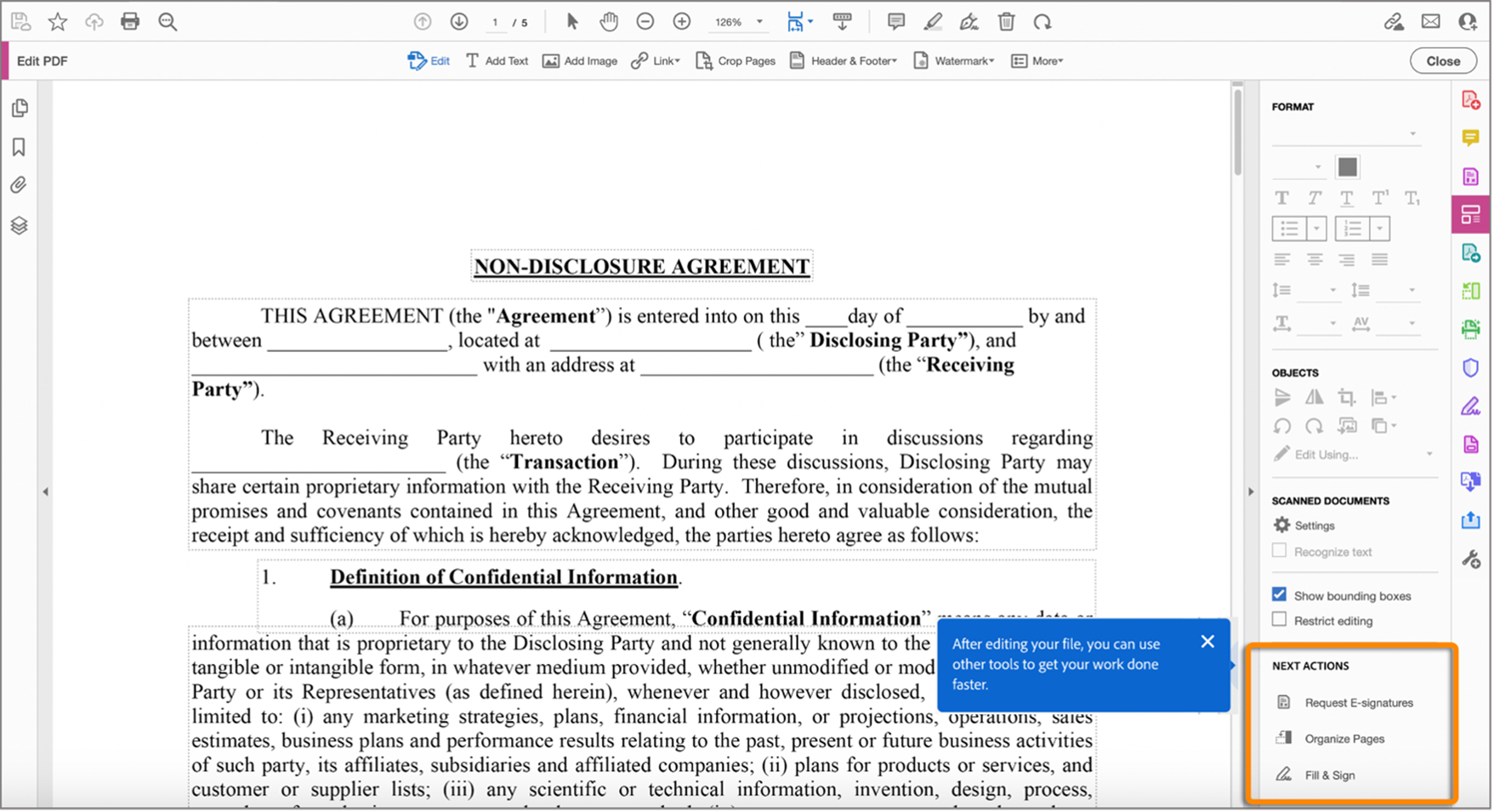 Теперь ИИ-помощник поддерживает действия на основе инструментов для команд и корпоративных пользователей. Используя естественный язык, попросите ИИ-помощника выполнить действия в ваших PDF, помогая вам работать быстрее.