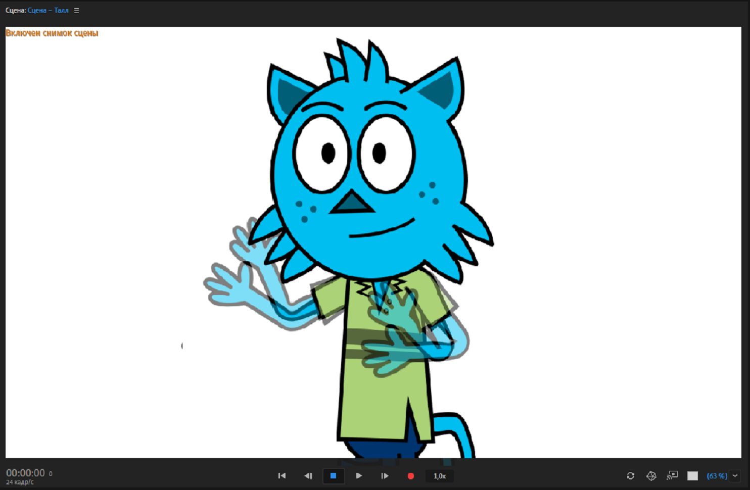 Непрозрачность активной марионетки уменьшается по мере увеличения непрозрачности снимка. Чтобы изменить прозрачность снимка, выберите Сцена > Увеличить непрозрачность снимка (Command+Option+=) или Уменьшить непрозрачность снимка (Command+Option+-).