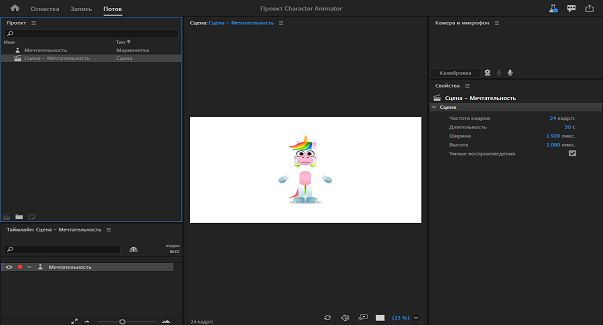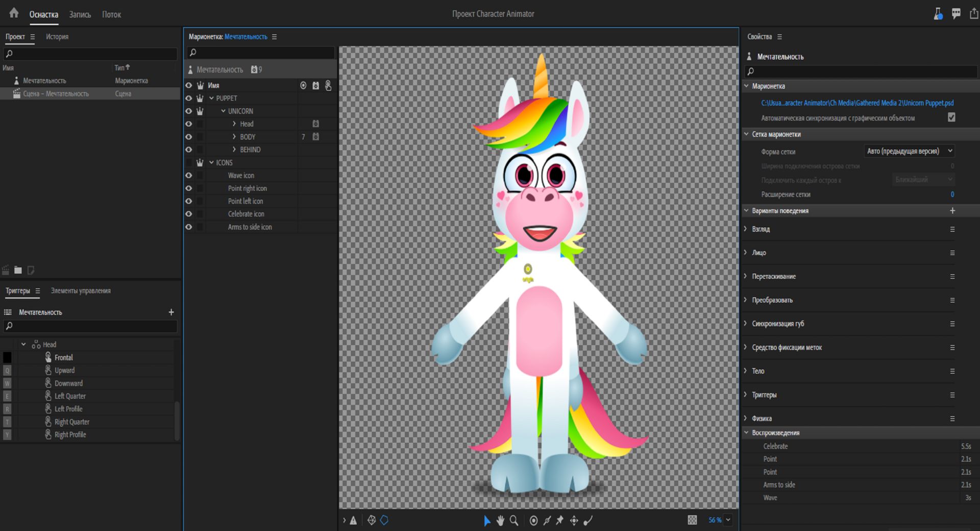 Запись, воспроизведение и точная настройка действия марионетки в рабочей среде. Можно настроить синхронность записанных дублей и изменить свойства поведения. На панели Проект можно добавить несколько марионеток на таймлайн.