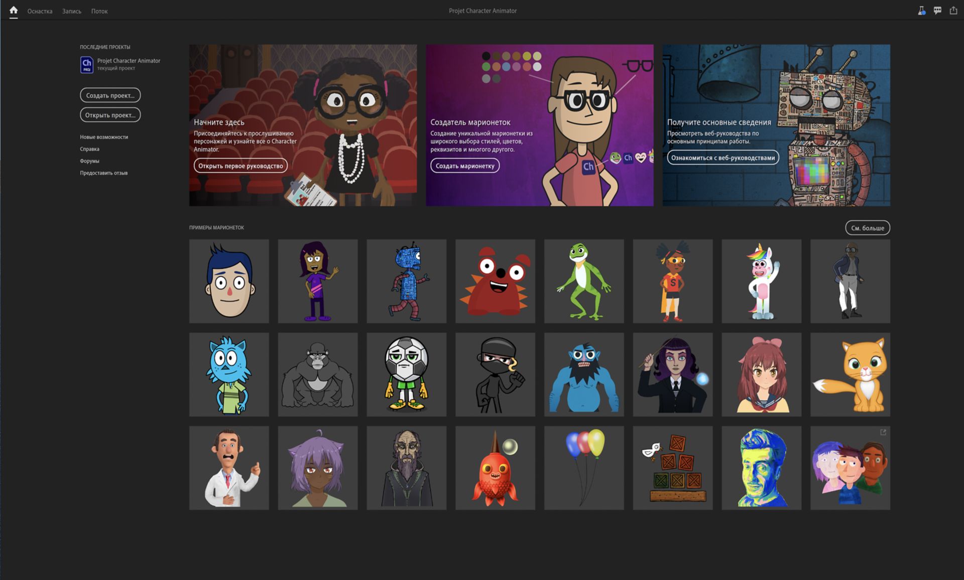 Домашний экран отображается при запуске приложения. В этой рабочей среде представлены вспомогательные ресурсы: интерактивное видеоруководство для начала работы, ссылки на полезные ресурсы в Интернете и шаблоны марионеток. Можно использовать ресурсы для получения сведений о Character Animator или начать экспериментировать с анимацией шаблонов марионеток.