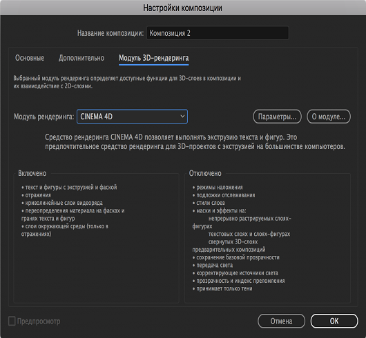 При выборе значения Cinema 4D в раскрывающемся меню «Модуль рендеринга» в столбце «Включены» отображаются включенные 3D-параметры, а в столбце «Отключены» отображаются 3D-параметры, которые не доступны.