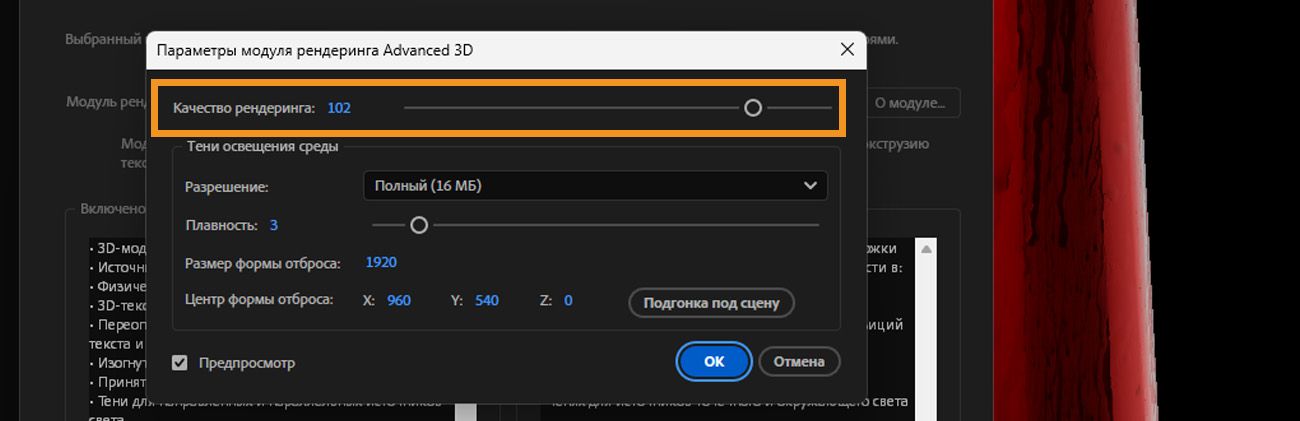 Для доступа к опции Параметры модуля рендеринга Advanced 3D выберите Параметры модуля рендеринга из меню Модуль 3D-рендеринга на панели Композиция.