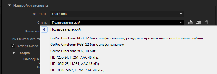 Для вывода результата в формат QuickTime в Adobe Media Encoder с помощью кодировщика GoPro CineForm предусмотрено три шаблона настроек, которые можно найти в диалоговом окне Настройки экспорта.