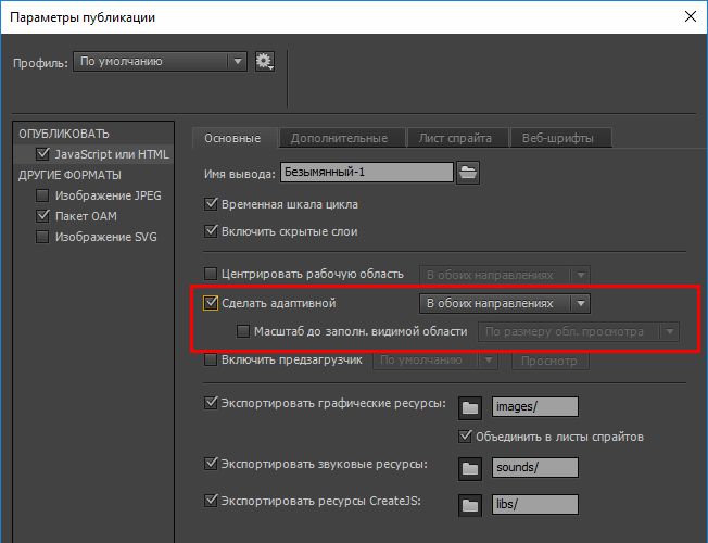 На вкладке Основные установите флажок Сделать адаптивной. Это обеспечивает адаптивность анимации в отношении ширины, высоты или обоих показателей, и изменять размер опубликованного вывода с учетом различных форм-факторов. В результате файлы вывода получаются адаптивными и совместимыми с HiDPI, а изображение — более четким.