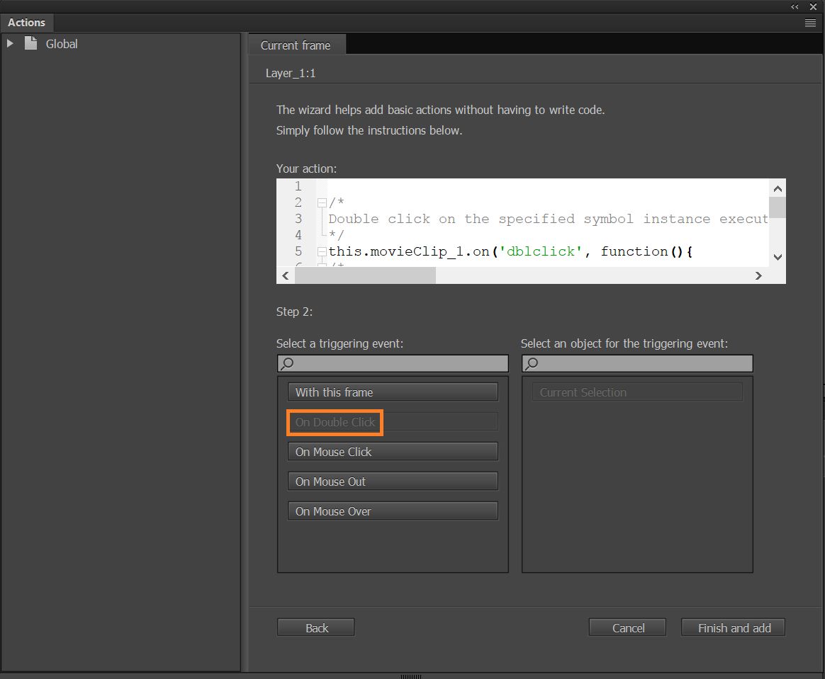 - Добавление интерактивных возможностей с помощью фрагментов кода в Animate