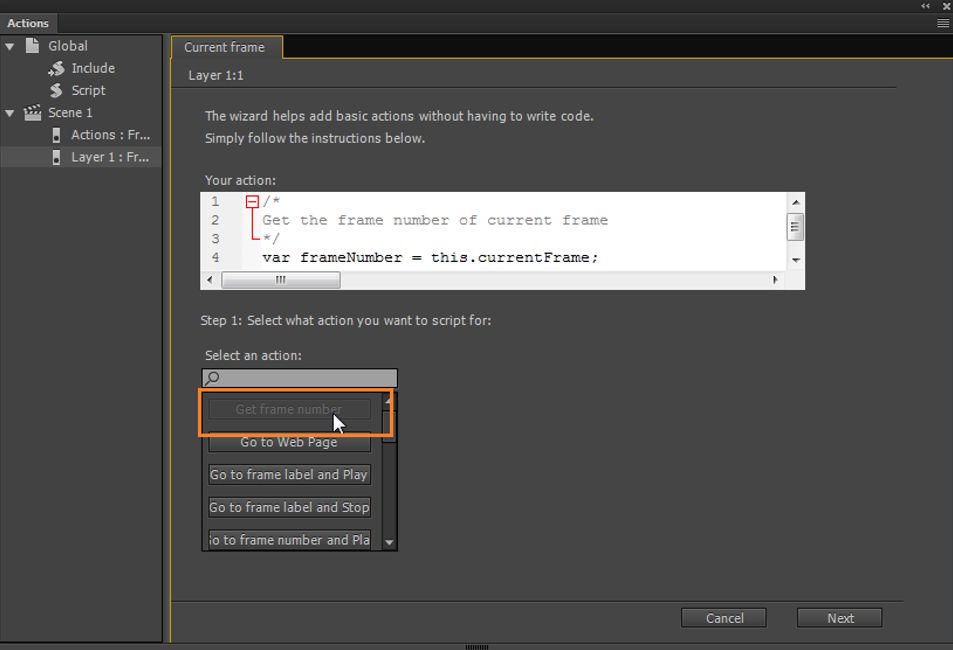 Пример снимка экрана, на котором представлены параметры мастера создания кода действий Пример снимка экрана, на котором представлены параметры мастера создания кода действий На приведенном выше снимке экрана выбрана операция Получить номер кадра, и в окне операции обновлен соответствующий код.