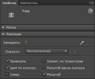 - После создания классической анимации выберите первый ключевой кадр анимации на временной шкале. В инспекторе свойств установите флажок «Цвет по контуру». Объект теперь готов к перемене цвета согласно цвету направляющей линии.