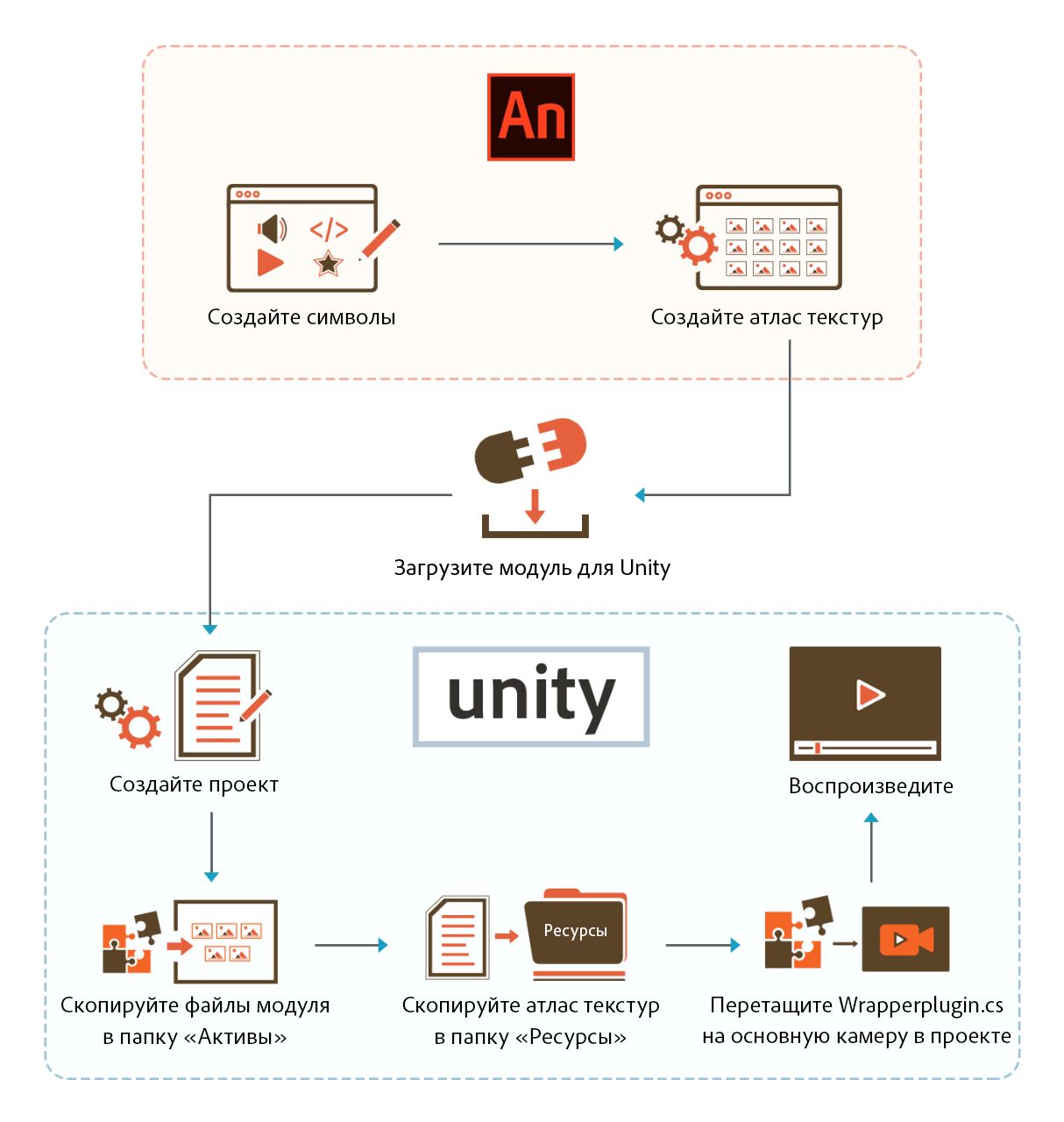 Процесс генерирования атласа текстур в Animate и его импорта в Unity представлен на следующей схеме.