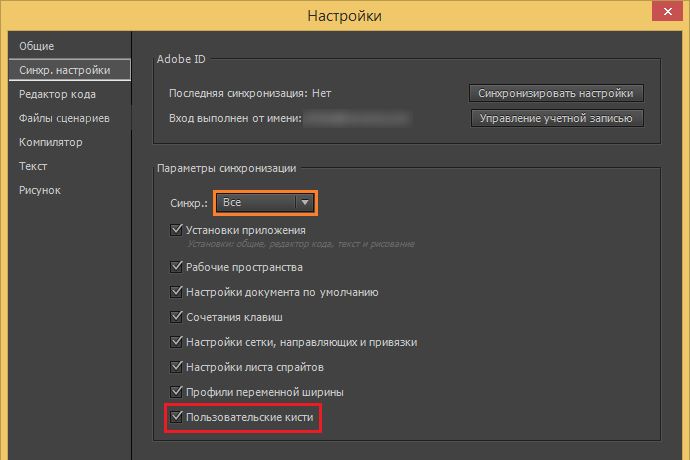 Созданные пользователем кисти можно синхронизировать с облаком, задав соответствующие установки в Animate. Для этого откройте меню «Правка» > «Настройки» (Windows) или Animate > «Настройки» (Mac). Параметр для синхронизации пользовательских кистей размещен под заголовком «Параметры синхронизации», как показано ниже.