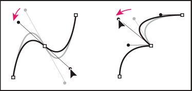 Для сравнения: у точки преломления может быть две, одна или ни одной линии направления, если в точке соединяются два изогнутых сегмента, точка связана с одним изогнутым сегментом или не связана ни с чем (соответственно). Линии направления точки преломления сохраняют преломление за счет использования различных углов. При перемещении линии направления в точку преломления изменяется только кривая с той стороны точки, где расположена линия направления.