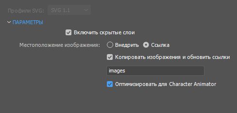 - Оптимизировать SVG для Character Animator: позволяет экспортировать SVG-файл, совместимый с Character Animator.