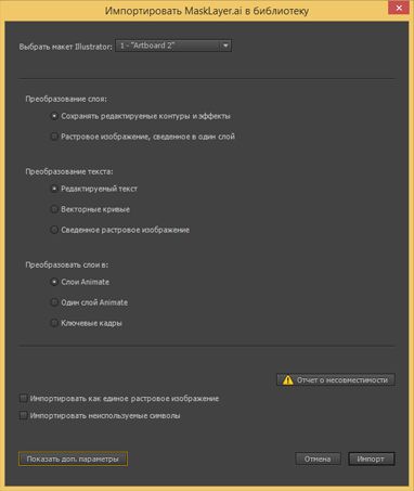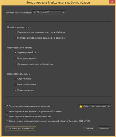 Установите режим «Чтобы устранить проблемы совместимости, измените параметры импорта». Многие несовместимости между Illustrator и Animate могут быть автоматически исправлены с использованием отчета о несовместимости и рекомендаций по импорту в области «Параметры импорта» в диалоговом окне «Импорт AI».