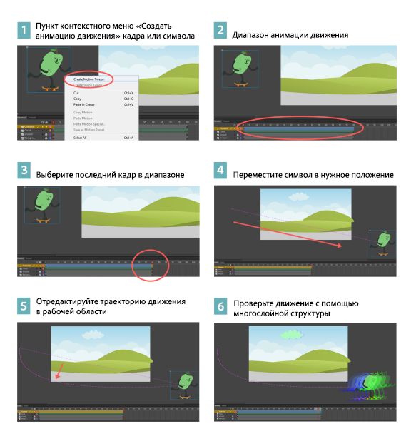 Когда анимация содержит движение, в рабочей области появляется траектория движения. Траектория движения показывает положение анимируемого объекта в каждом кадре. Можно изменить траекторию движения в рабочей области, перетаскивая его контрольные точки. Нельзя добавлять направляющую движения в слой анимации или обратной кинематики. Дополнительные сведения об анимации с использованием обратной кинематики см. в разделе Анимация каркаса. |
