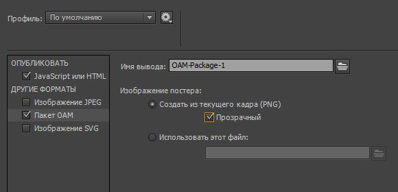 Теперь можно экспортировать содержимое Animate формата ActionScript, WebGL или HTML5 Canvas в файлы анимированных виджетов формата OAM (.oam). Файлы формата OAM, создаваемые в Animate, можно импортировать в Dreamweaver, Muse и InDesign. Чтобы экспортировать содержимое Animate в формат OAM, выполните следующие действия: