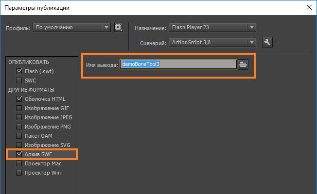 Выберите документ ActionScript, затем откройте «Файл» > «Настройки публикации» > «Другие форматы» > «SWF-архив».