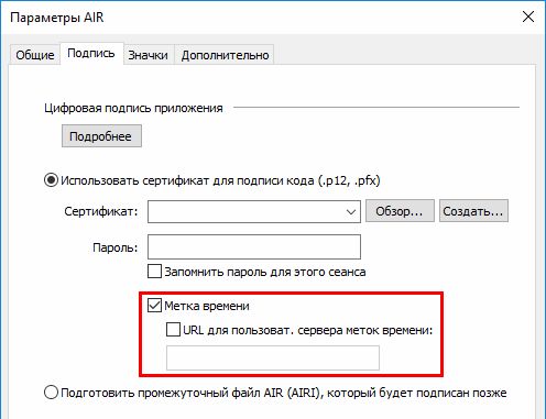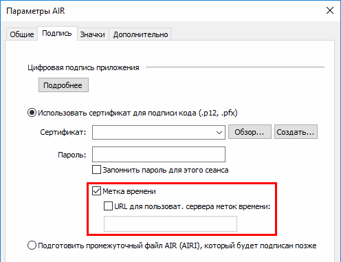 На вкладке «Подпись» выберите «Подготовить промежуточный файл AIR (AIRI) для последующей подписи» и щелкните ОК.