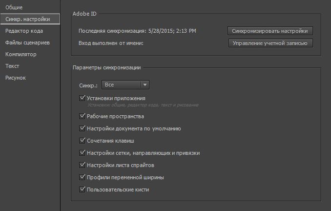 - Для синхронизации настроек с настройками Creative Cloud нажмите кнопку «Синхронизировать настройки».