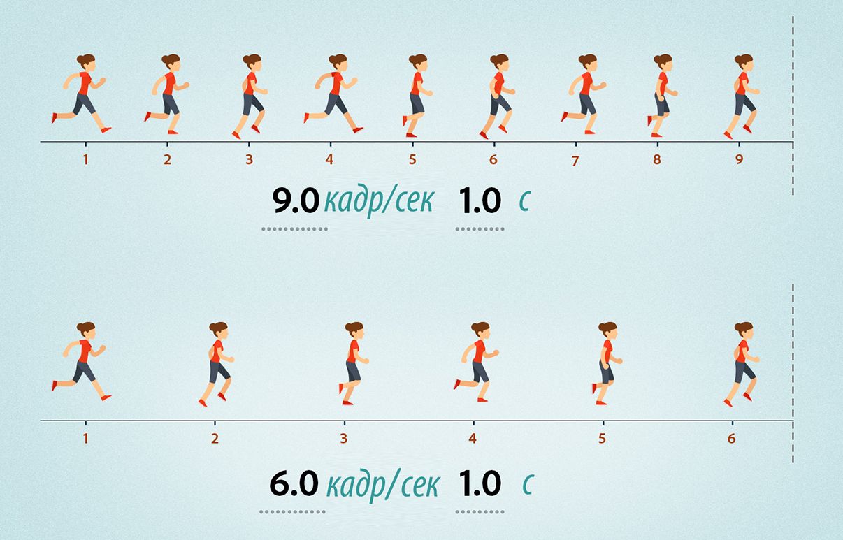 Частота кадров (скорость, с которой воспроизводится анимация Adobe Animate) измеряется как число кадров в секунду (FPS). При слишком низкой частоте кадров анимация выглядит так, как будто она останавливается и снова начинается, а при слишком высокой частоте кадров происходит размытие деталей анимации. Частота кадров 24 кадра/сек является принятой по умолчанию для новых документов Animate, и обычно именно с такой настройкой достигаются лучшие результаты при отображении веб-страниц. (Стандартная частота кадров для фильмов также составляет 24 кадра/сек.)