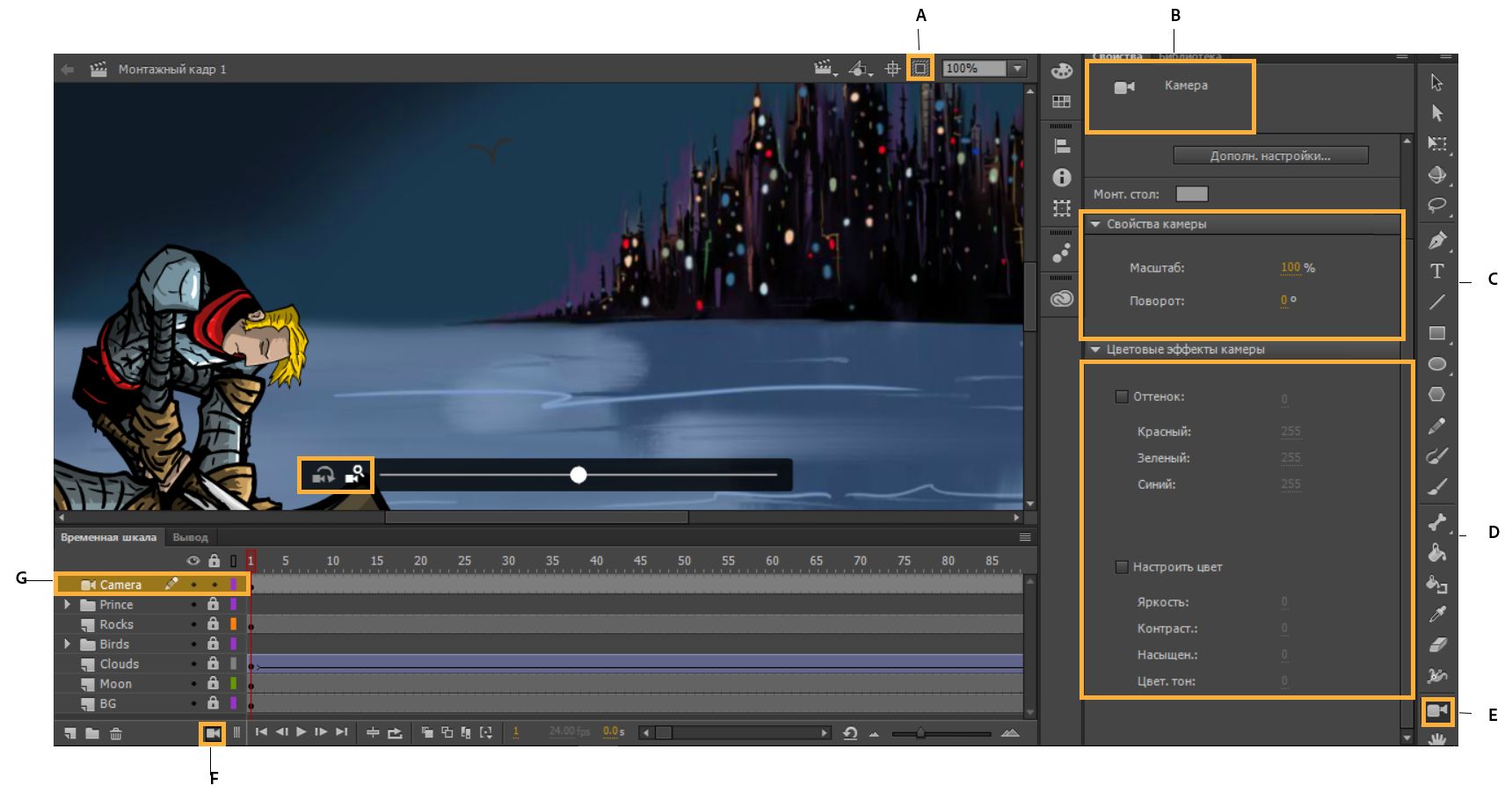 Используя камеру и вид рабочей области, можно просматривать содержимое в рамках области камеры.