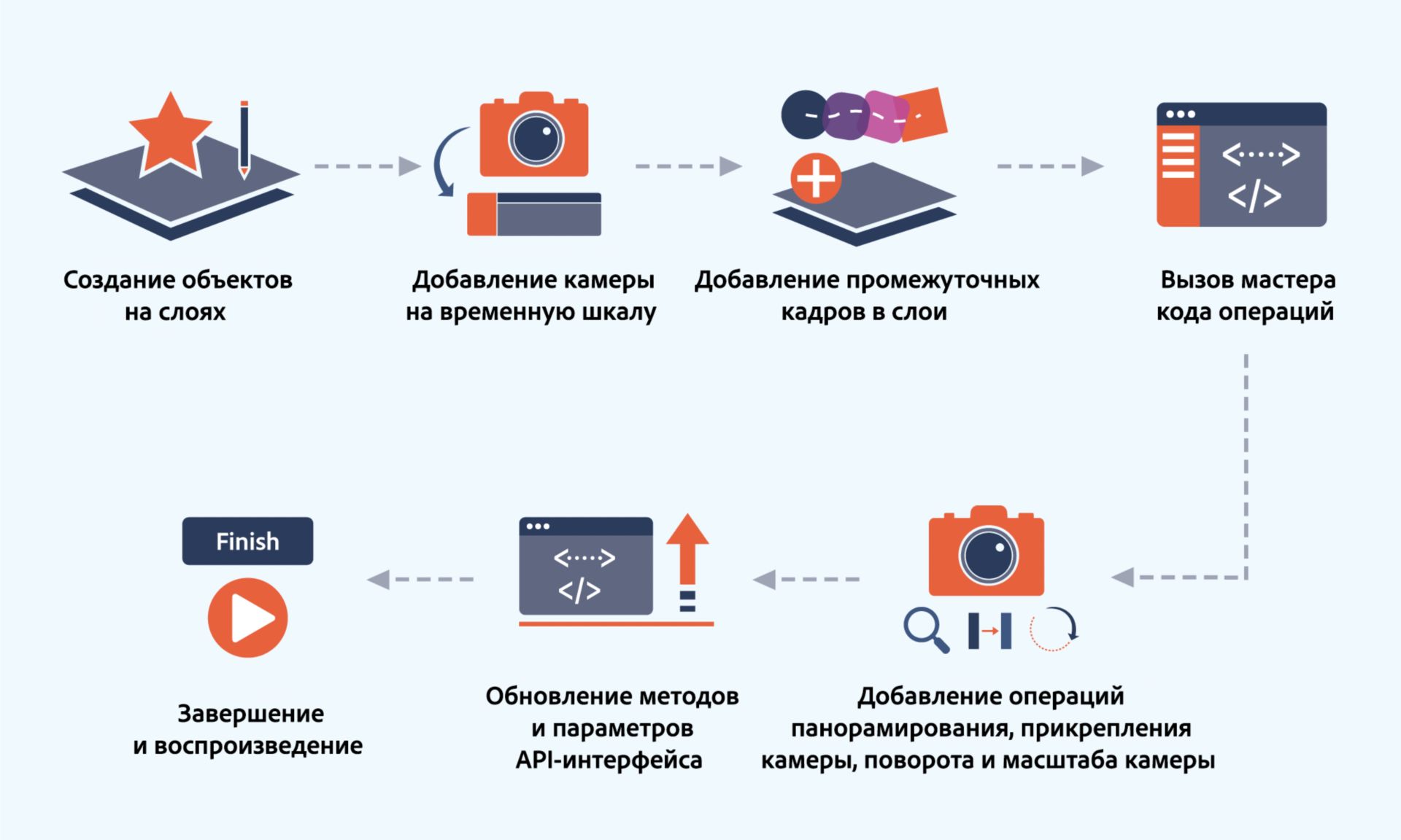 На следующей схеме описывается пошаговый подход к созданию анимации с использованием интерактивной камеры. Можно использовать мастер кода операций в документе HTML Canvas.