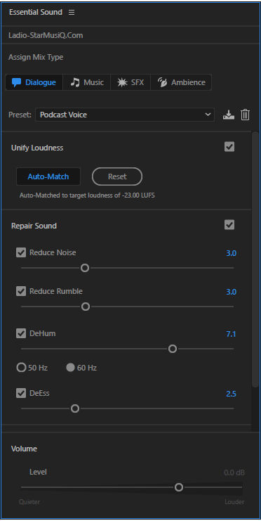 From the Match To drop-down list, select a loudness standard that suits your regional standards and content. For your podcast, choose the ITU broadcast standard preset that sets the Target Loudness to -18 LUFS.