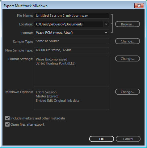 To export using Audition, choose your format, sample type, format settings, and mixdown options by clicking the Change button in the Export Multitrack Mixdown or Save As dialog boxes.