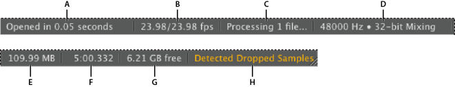 A. Time to open, save, or process file B. Video Frame Rate C. File Status D. Sample Type E. Uncompressed Audio Size F. Duration G. Free Space H. Detect Dropped Samples