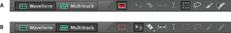 The toolbar provides quick access to tools, the Workspace menu, and buttons that toggle between the Waveform and Multitrack editors. Some tools are unique to each view. Likewise, some Waveform Editor tools are available only in the spectral display.