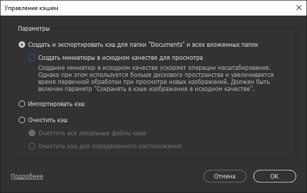 Примечание. При создании кэша учитывается уровень доступа каждой папки. Операция экспорта создает индексы, миниатюры и изображения предварительного просмотра и сохраняет сведения о версии экспорта в папке общего кэша. Программа Bridge также экспортирует метаданные файлов.