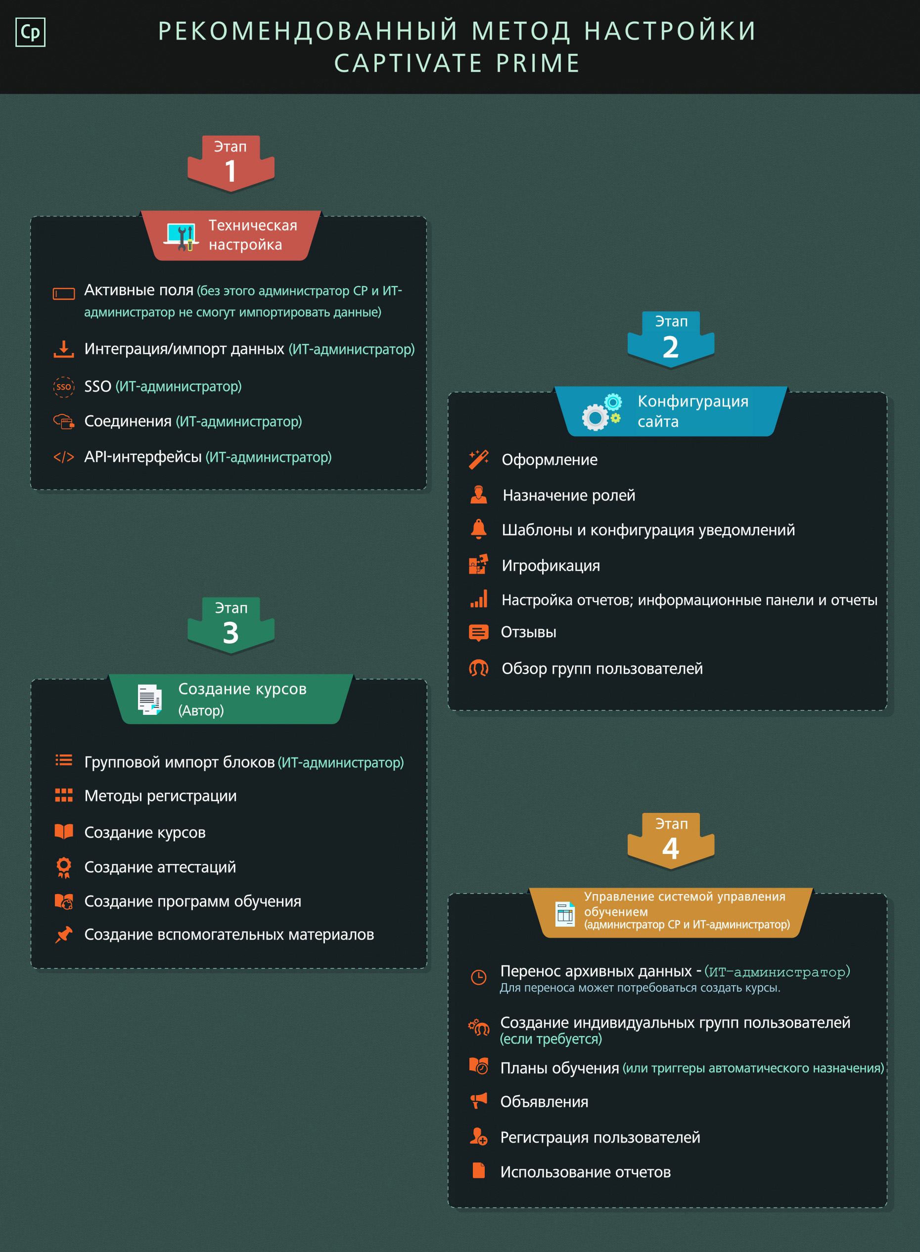 Эти этапы можно выполнять в трех различных ролях одним или несколькими пользователями — это зависит от конфигурации вашей организации. Три роли для настройки Captivate Prime: