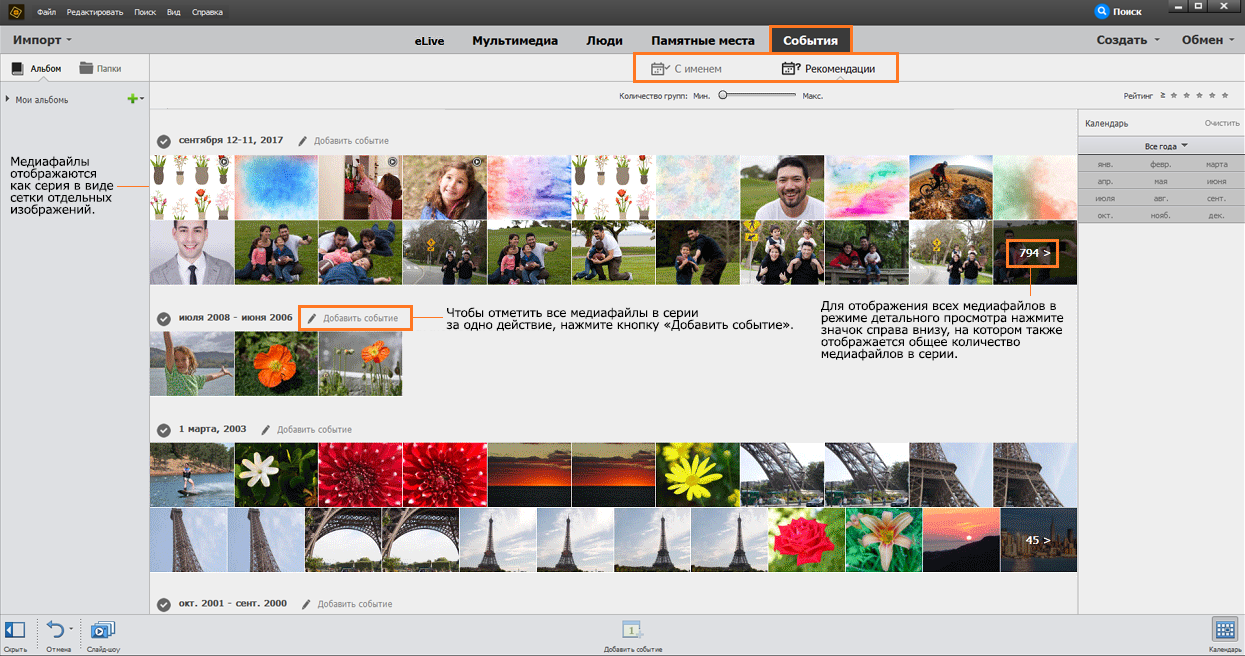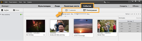 Часто пользователям требуется объединить фотографии или видеофайлы в соответствии с каким-либо событием, например, свадьбой или днем рождения. Elements Organizer предоставляет два способа упорядочить медиафайлы по событиям: