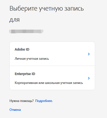 Возможно, у вас уже есть идентификатор Adobe ID, связанный с вашим рабочим адресом электронной почты. Возможно, при регистрации вы использовали Adobe ID с тем же адресом электронной почты, что и у вашего Enterprise ID или Federated ID (подробнее о Enterprise ID и Federated ID см. в статье Общие сведения об удостоверениях). В таком случае система отобразит экран выбора учетной записи и попросит выбрать учетную запись, в которую вы хотите войти.