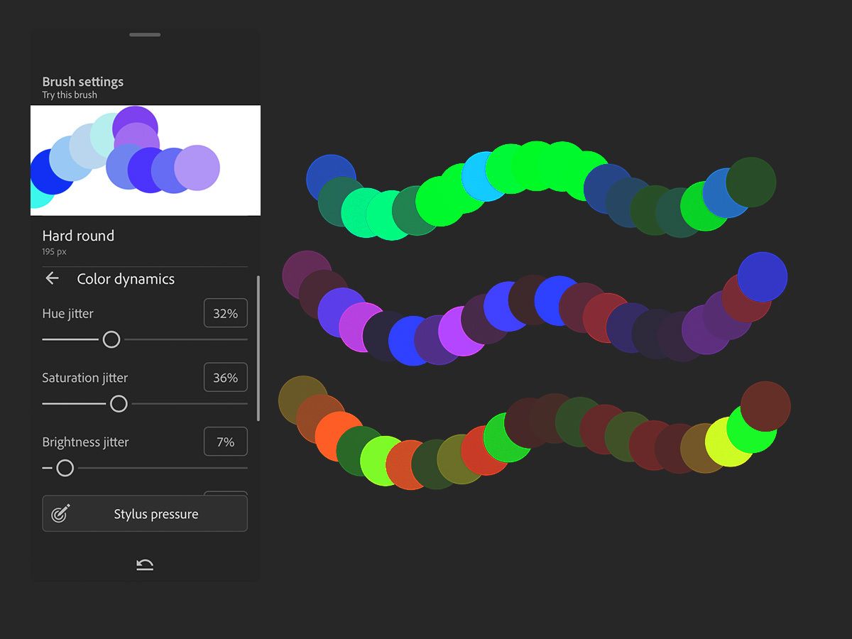 Улучшайте цвет любой краски, оттенок, насыщенность, яркость, настройки дрожания и динамику цвета при рисовании любого мазка.