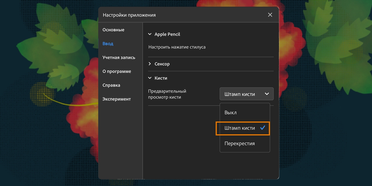 Предварительный просмотр оттиска кисти позволяет более точно использовать пиксельные кисти и ластики, создавая узоры в момент касания пальцем или карандашом поверхности экрана. Предварительный просмотр оттиска кисти выключен по умолчанию.