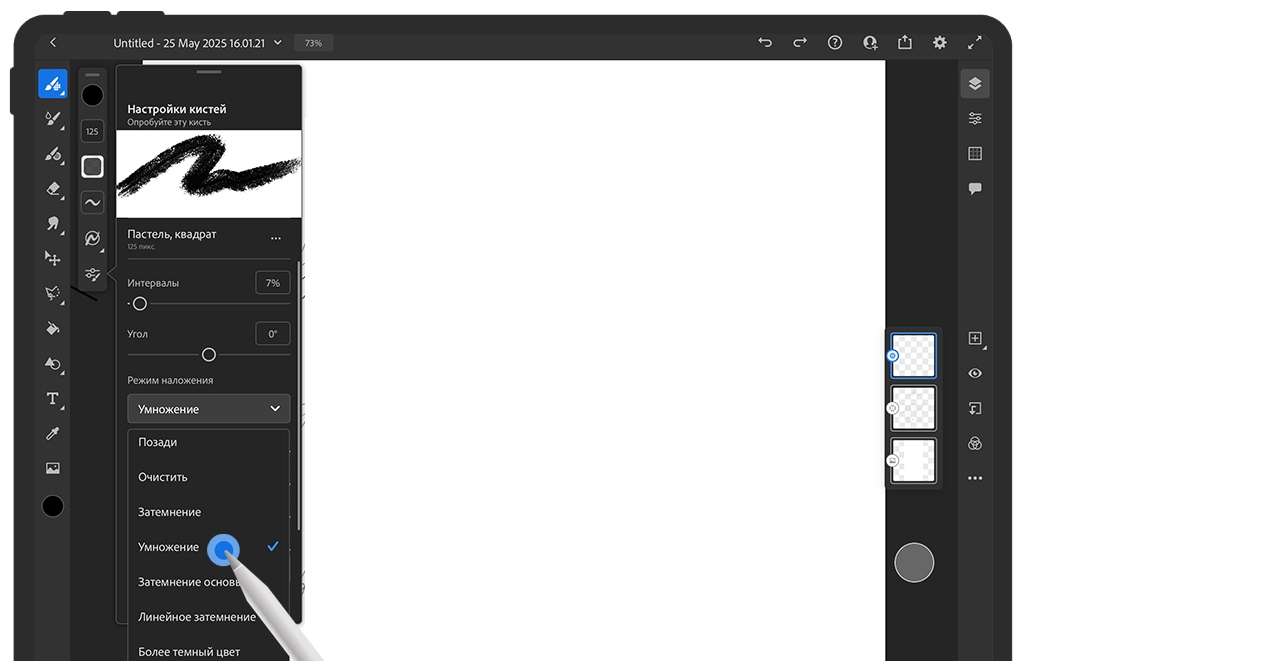 Нажмите значок Настройки кисти для настройки параметров кисти, таких как Интервал, Угол, Режим наложения, Нажим стилуса и многое другое.