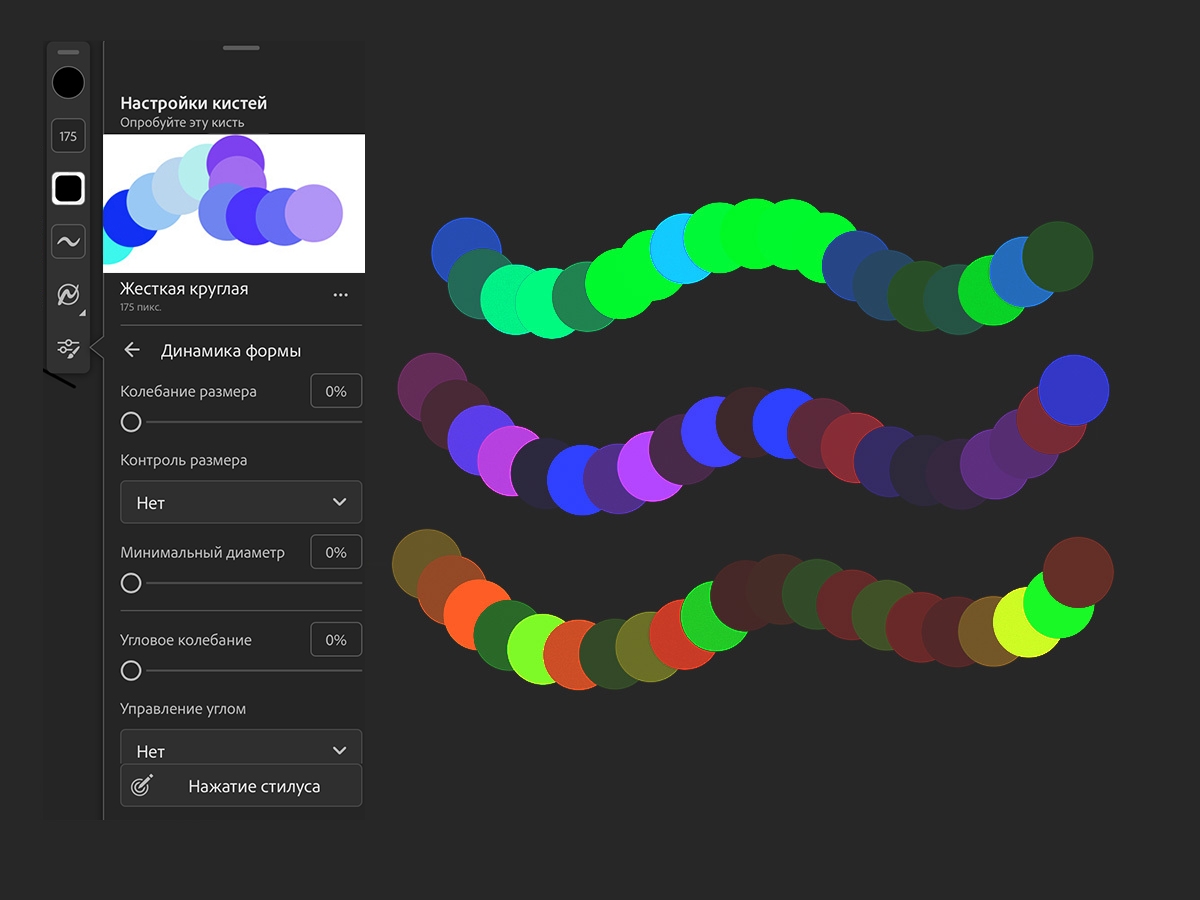 Чтобы изменить динамику цвета, нажмите Настройки кисти, а затем Динамика цвета, чтобы выбрать один из представленных ниже параметров кисти: