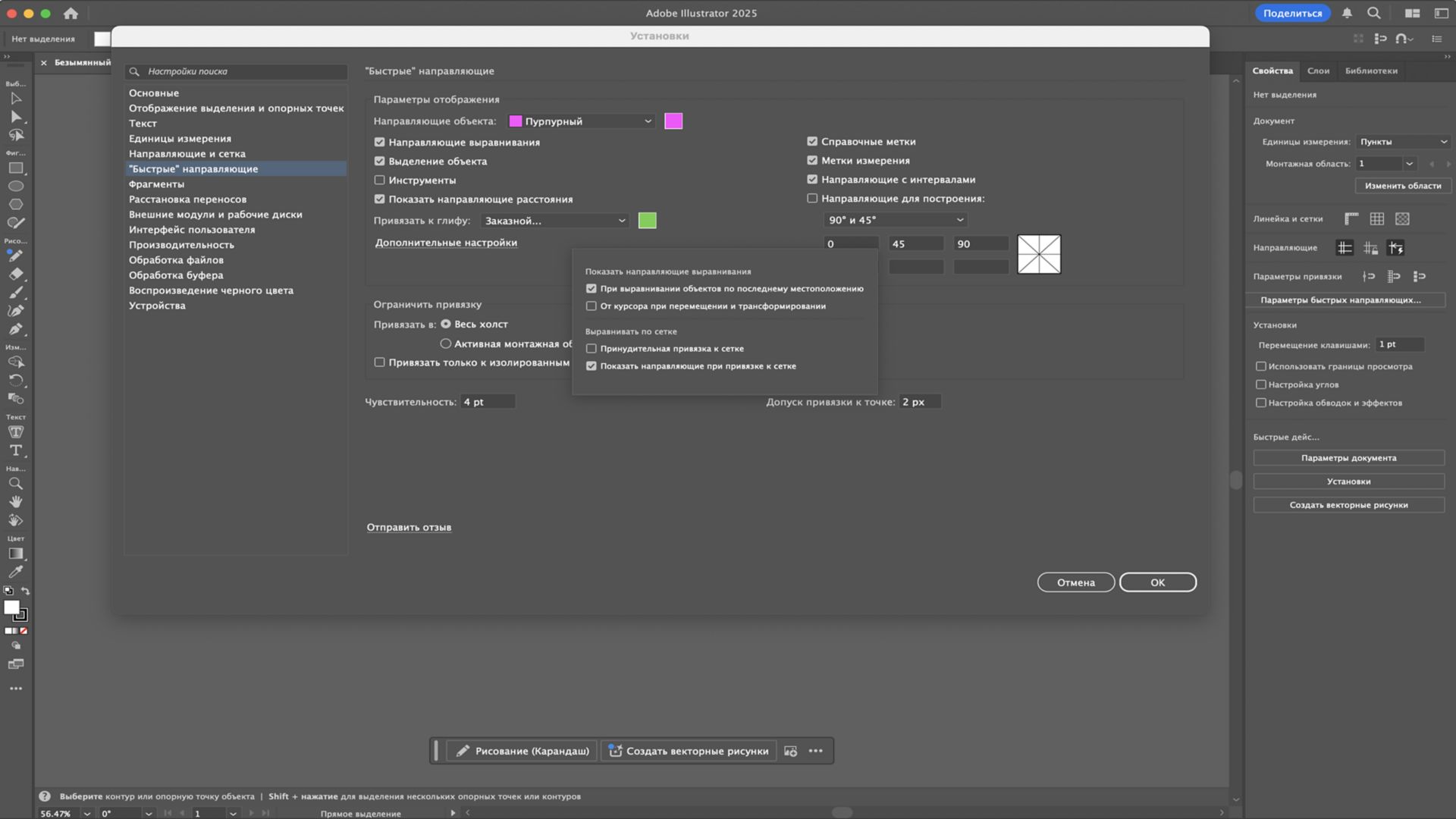 Используйте новые дополнительные настройки быстрых направляющих, чтобы настроить выравнивание и привязку объектов на холсте. Выберите, нужно ли принудительно выполнять привязку к сетке, настройте допуск привязки или отображайте направляющие во время привязки, чтобы привязка легко адаптировалась к вашей работе.