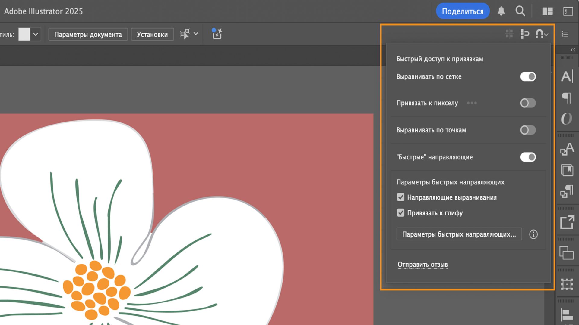 Привязка в Illustrator теперь стала более отзывчивой, гибкой и точной. Благодаря более умным быстрым направляющим, четкой визуальной обратной связи и настраиваемым параметрам привязки можно выравнивать фигуры именно там, где нужно — будь то привязка к сеткам, повернутым объектам или другим элементам.