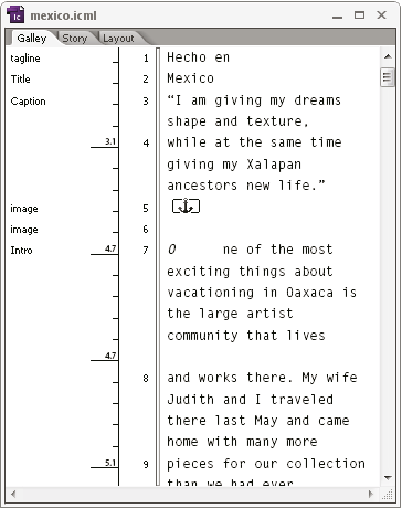 Режим просмотра «Материал» открывается по умолчанию при создании нового материала InCopy.
