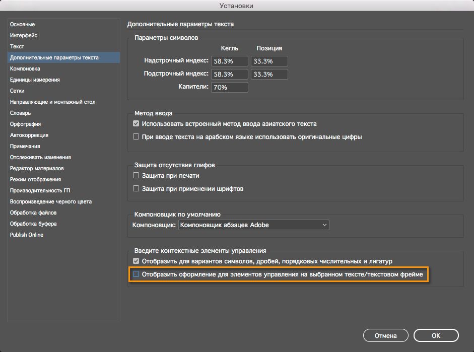 В InDesign перейдите в меню Правка > Установки > Дополнительные параметры текста.