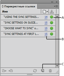 При вставке перекрестной ссылки ее состояние отображается на панели «Перекрестные ссылки». Например, значками показывается место расположения текста привязки — на монтажном столе
