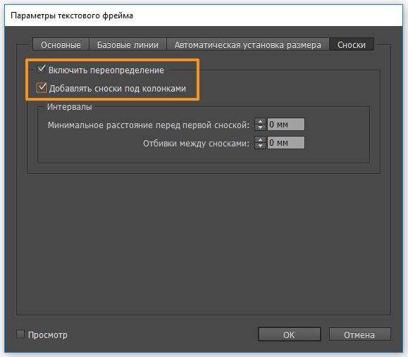Этот параметр позволяет отобразить сноски сразу под несколькими колонками (в текстовом фрейме с несколькими колонками).