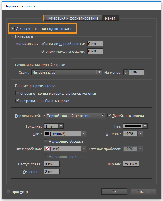 Параметры макета сноски
