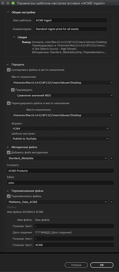 Использование шаблонов настроек вставки в Media Encoder