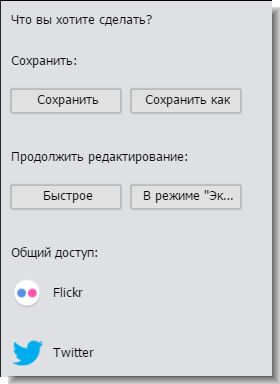 Панель «Общий доступ» отображается справа от изображения. На этой панели изображение можно сохранить в том же расположении или как другую фотографию. Изображение можно открыть в режиме «Быстрое» или «Эксперт». Кроме того, фотографию можно опубликовать на Flickr и в Twitter.