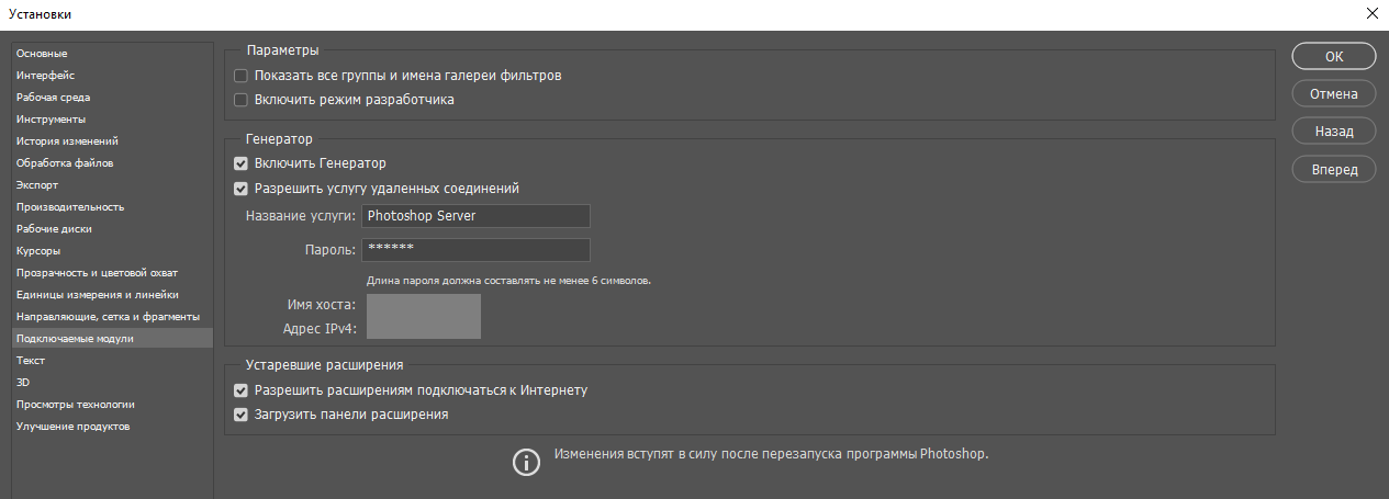 Разрешив услугу удаленных соединений в Photoshop, создайте пароль для службы и нажмите ОК.